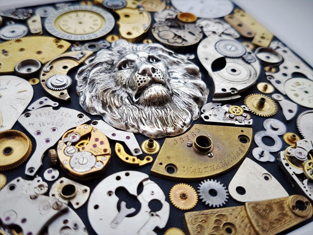 alt. Das Bauteil mit der Inschrift "Waltham" mit der Seriennummer "856785" (Unter dem Löwenkopf) ist beispielsweise aus dem Jahr 1875. Viele dieser alten Uhrwerks-Teile